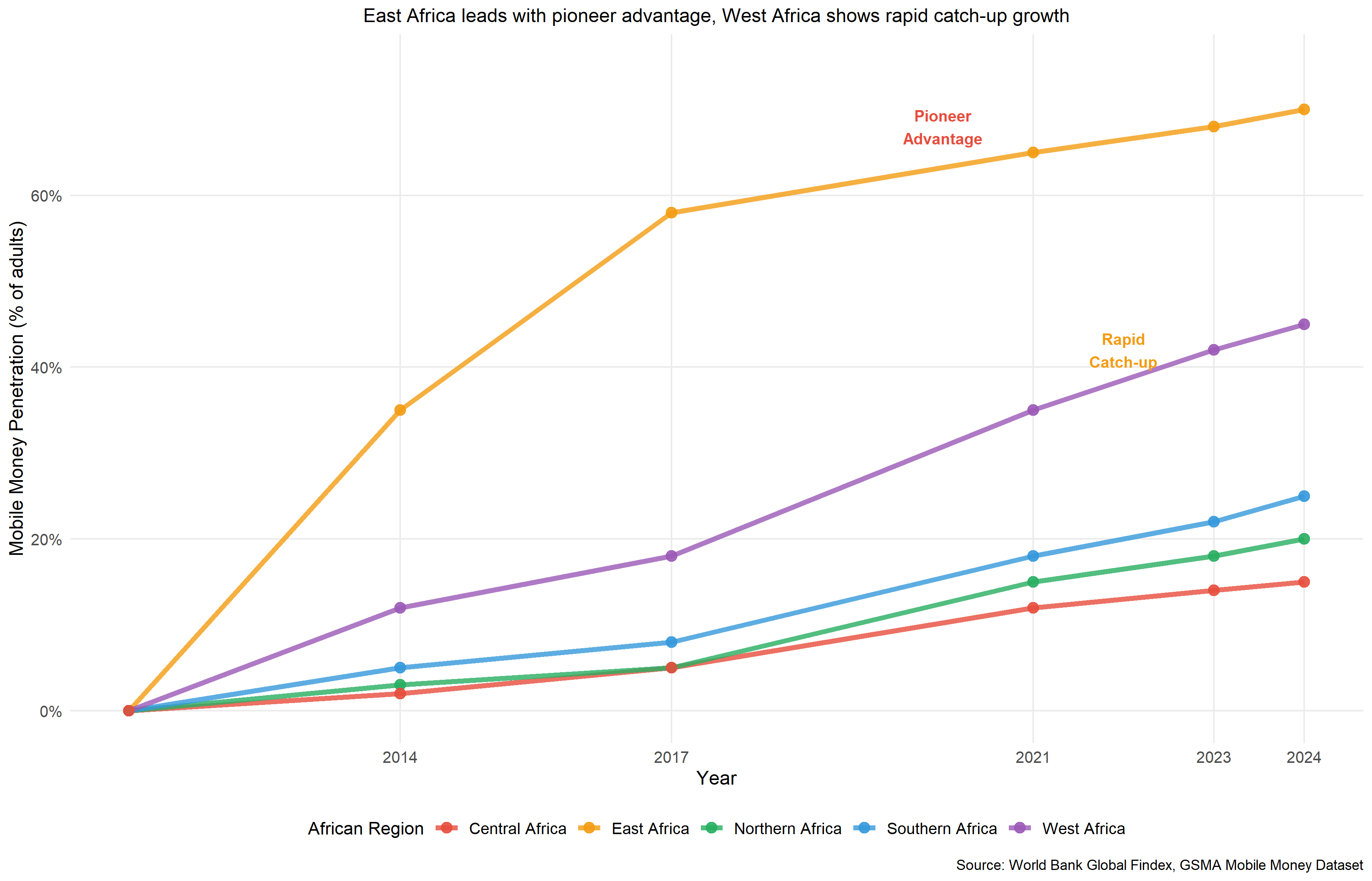 Source: GSMA Mobile Money Dataset and World Bank Global Findex Database. East Africa leads with pioneer advantage, while West Africa shows dramatic catch-up growth. Regional variations reflect different adoption strategies based on local economic and regulatory conditions.