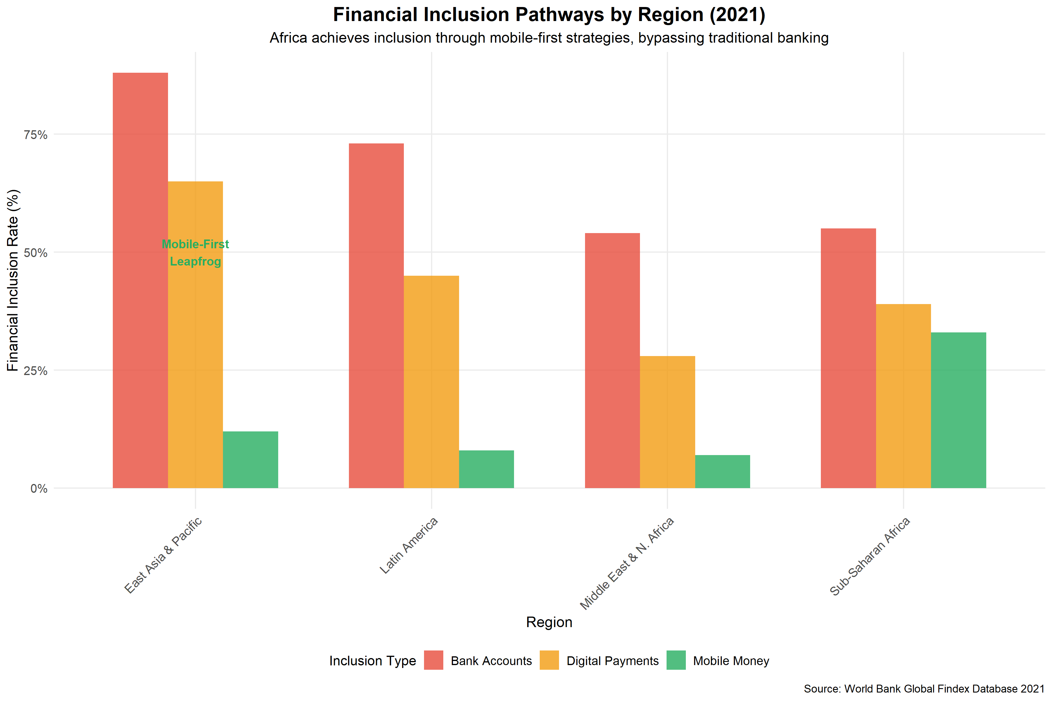 Africa's fintech evolution differs fundamentally from financial development patterns observed in other developing regions, revealing unique structural advantages that enable leapfrogging at unprecedented scale and velocity. The verified data demonstrates that while Latin America achieved 73% account ownership through traditional banking expansion, Sub-Saharan Africa reached 55% through mobile-first solutions that bypassed physical infrastructure requirements entirely, simultaneously creating the platform for the continent's current leadership in global mobile money services (World Bank, 2021).