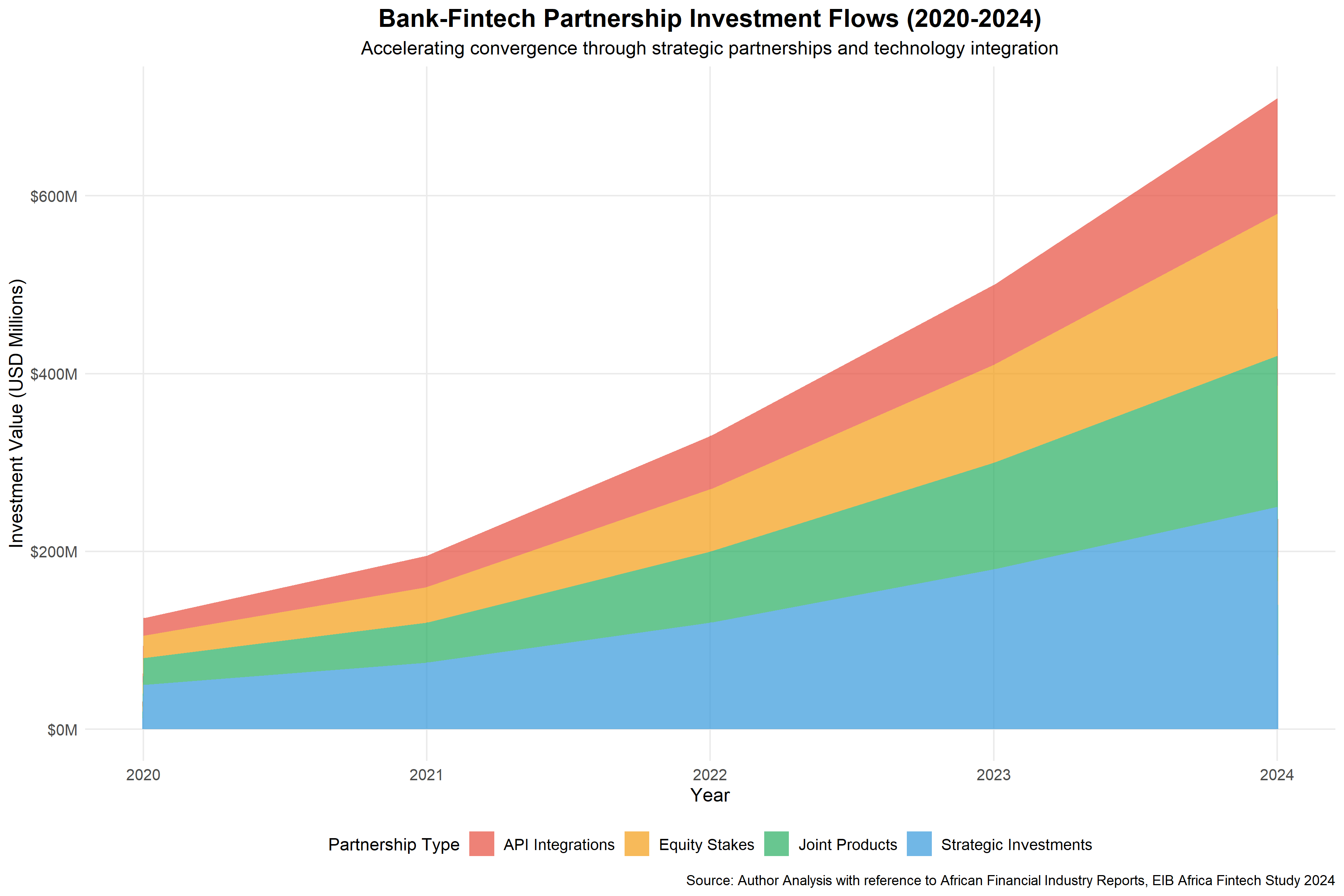 Source: Author analysis with reference to African Financial Industry Reports, EIB Africa Fintech Study 2024. The stacked chart demonstrates accelerating convergence through multiple partnership channels, with strategic investments leading growth followed by API integrations and joint product development.