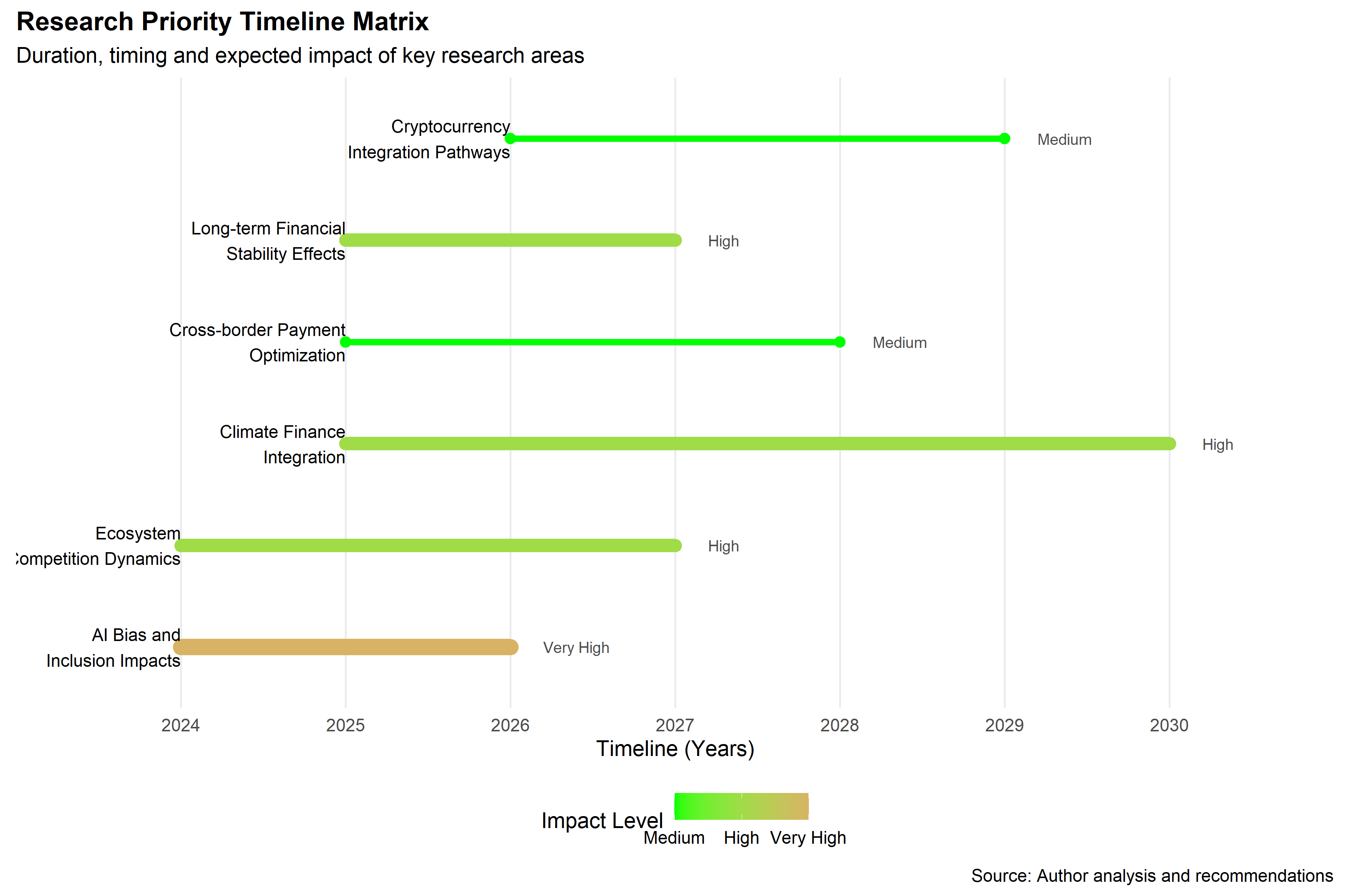 Source: Author analysis and recommendations. Research priority bubble chart showing duration, timing, and expected impact of key research areas necessary for understanding and optimizing Africa's continued financial transformation through 2030.